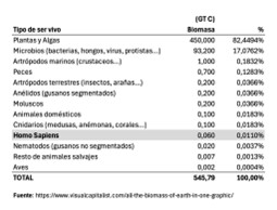 - Nuestra biomasa es mínima: el hombre representa tan solo el 0,01% de la biomasa total de la biosfera (casi cualquier tipo de bacteria, hongo, protista o archaea nos supera en biomasa por decenas o centenas de veces). Las moléculas orgánicas se diferencian de las inorgánicas porque se componen básicamente de cadenas de carbono. Por eso la biomasa (la masa de los seres vivos) generalmente se mide en toneladas de carbono. Esta es la biomasa de las cerca de 9 millones de especies conocidas, medida en giga toneladas de carbono (Gt C):